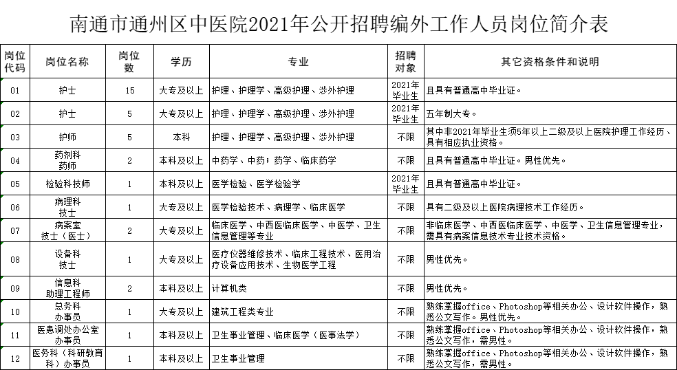 5.具備擬招聘崗位所需的相關(guān)資格條件(具體崗位見附件1:《南通市通州區(qū)中醫(yī)院2021年公開招聘編外工作人員崗位簡介表》)。